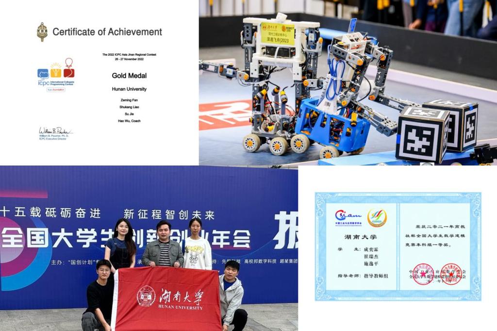 出台《湖南大学大学生创新创业训练计划管理办法》,支持和鼓励学生以科研训练成果参加各类竞赛。获国际级、国家级奖项800余项,其中中国国际“互联网+”大学生创新创业大赛金奖5项、ACM-ICPC 国际大学生程序设计竞赛金奖6项、中国机器人大赛暨RoboCup机器人世界杯中国赛一等奖5项、全国大学生数学建模竞赛一等奖4项。入选首批国家级创新创业学院建设单位,获批湖南省双创示范基地。